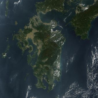 Kyushu est la plus au sud-ouest des quatre îles principales du Japon, s'étendant sur une côte accidentée avec des baies, des péninsules et des îlots au large. Des montagnes volcaniques traversent le paysage, et les plateaux alternent avec les vallées fluviales et les zones de sources thermales.