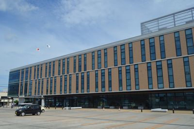 La gare se trouve dans le centre et offre des liaisons le long de la plaine de Tsugaru et vers les quartiers côtiers. Le hall Tachineputa près de la gare expose de grands chars de fête et dispose d'une plateforme d'observation au sixième étage.