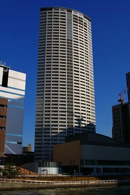 The Tower Osaka est un gratte-ciel de 177 mètres de haut avec 52 étages et une façade en verre et acier qui définit l'horizon moderne d'Osaka. Le bâtiment combine des espaces de bureaux, des zones commerciales et des appartements dans une structure intégrée.