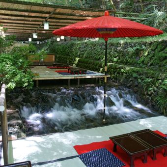 De juin à septembre, les visiteurs peuvent dîner sur des terrasses en bois qui s'étendent directement au-dessus de la rivière, offrant une expérience rare de repas au-dessus de l'eau courante. Ces terrasses extérieures saisonnières sont une caractéristique locale qui surprend souvent les clients.