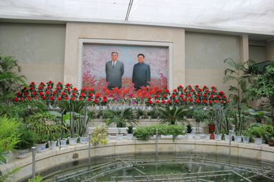 Le hall d'exposition présente deux fleurs distinctes: la Kimilsungia, une orchidée pourpre, et la Kimjongilia, une bégonia rouge, dans de nombreuses compositions à travers le bâtiment.