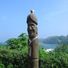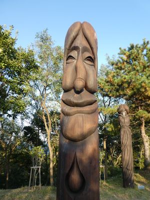 Le parc s'étend le long de la côte avec des sculptures en bois et en pierre disposées sur plusieurs niveaux reliés par des chemins.