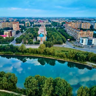 Oskemen est une grande ville de l'est du Kazakhstan située au confluent de l'Ulba et de l'Irtych dans les monts Roudny Altaï. L'agglomération s'étend sur plusieurs quartiers urbains le long des deux rives, reliant des immeubles d'appartements de l'époque soviétique à des zones résidentielles et commerciales plus récentes.