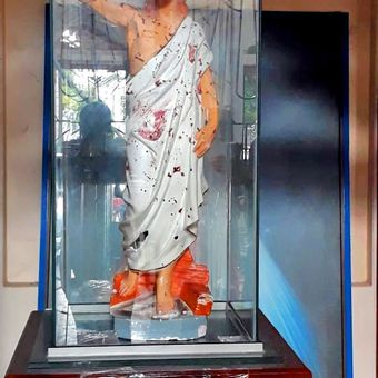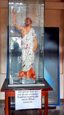 La statue survivante du Christ Ressuscité dans l'église porte les marques de l'attentat de 2019, servant de mémorial aux victimes.