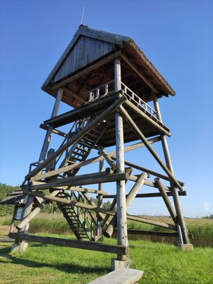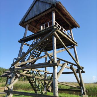 Birdwatching tower I in Kaņieris, dřevěná rozhledna, jezero Kaņieris, Lotyšsko