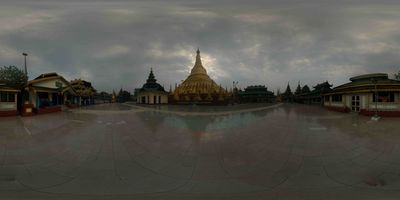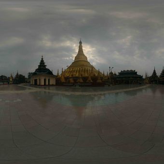 La pagode présente un stupa central qui s'élève depuis une large base, avec des détails architecturaux illustrant le design religieux birman traditionnel.