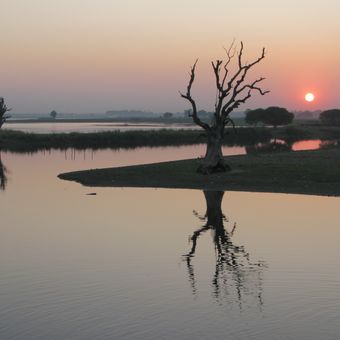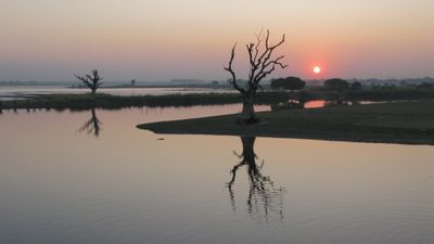 Le lac Taungthaman s'étend dans la région de Mandalay, relié par une passerelle en teck de 1,2 kilomètre traversant ses eaux.