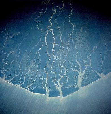 Le delta du Niger s'étend sur 70 000 kilomètres carrés où le fleuve Niger se ramifie en de nombreux cours d'eau avant de se jeter dans le golfe de Guinée.