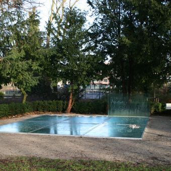 Le Spiegelmonument présente des miroirs brisés qui réfléchissent le ciel et contient une urne avec les cendres des victimes du camp d'Auschwitz.