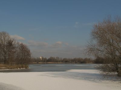 Le lac occidental, premier à être excavé, conserve un dépôt de sable sur sa rive sud, vestige des opérations minières originelles.