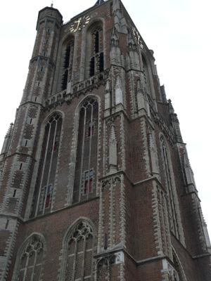 La Grote Kerk est une église gothique avec une tour frappante d'environ 60 mètres de haut, décorée de motifs en pierre glacée et dotée d'une tourelle d'escalier octogonale sur son côté nord-est. L'intérieur présente des voûtes en bois et des cadres de fenêtres en fonte qui caractérisent la nef.