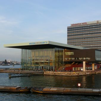 Le Muziekgebouw aan 't IJ présente une façade vitrée avec trois grands balcons surplombant la rivière IJ et le front de mer.
