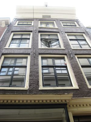 Pand met gevel onder rechte lijst, met uitstalkast in de houten pui, building in Amsterdam, Netherlands