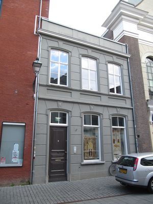 Huis met gebosseerd gepleisterde lijstgevel, bekroond door een attiek en voorzien van segmentvormig overtoogde vensters, house in Breda, Netherlands