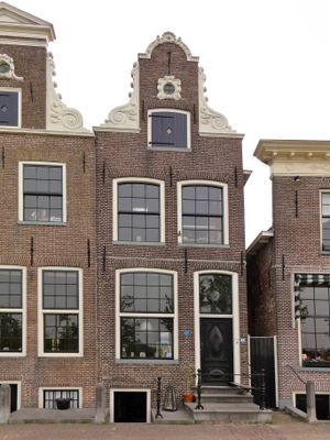 Huis met klokgevel met geveltop met natuurstenen aanzetvoluten en topstuk met jaartalcartouche en schelpversiering