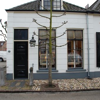 Pand met gepleisterde gevel. Goede vensters en deur. Stoeppaal met kettingen. Keitjesstoep, lindeboom