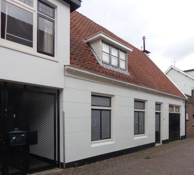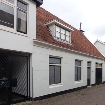 Pand met gepleisterde lage lijstgevel, Rijksmonument op Brugstraat 6
