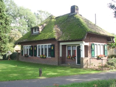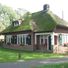 Boerderij onder hoog, rieten wolfsdak, dat uitsteekt boven de voorgevel