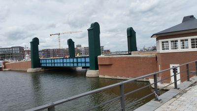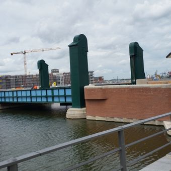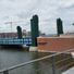 Le Gevlebrug relie plusieurs îles artificielles dans le quartier de Houthaven par une structure fixe avec des culées caractéristiques en briques et des tours de levage.