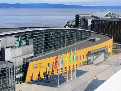 Les visiteurs peuvent observer le Trondheimsfjorden et Munkholmen depuis la cafétéria tout en profitant de rafraîchissements sans tenue de bain.