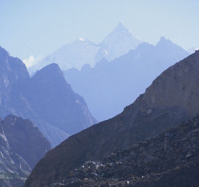 Lupghar Sar atteint une altitude de 7 200 mètres dans la chaîne Hispar Muztagh du Karakoram, avec des pentes glaciaires et des formations rocheuses.