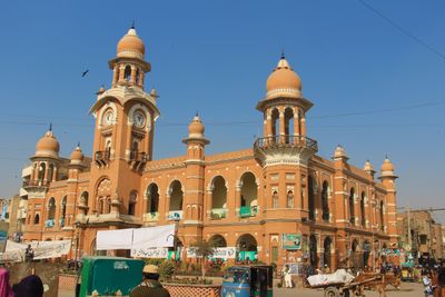 Ghanta Ghar est un bâtiment administratif de quatre étages à Multan surmonté d'une tour horloge bien visible centrée sur sa façade. La structure affiche l'architecture indo-sarrasine avec des arcs, des colonnes et des sculptures en pierre détaillées qui ornent ses murs extérieurs.