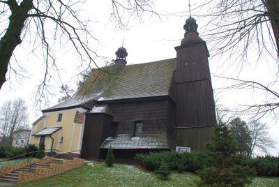 L'église de Tous les Saints se trouve aux coordonnées 50.4741, 18.6028, présentant des méthodes traditionnelles de construction en bois.