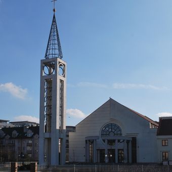 L'Église de la Pentecôte présente des éléments architecturaux contemporains avec de grandes fenêtres et des formes géométriques qui définissent sa structure moderne.