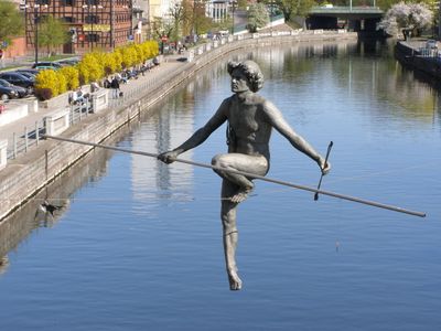 Przechodzący przez rzekę est une sculpture métallique suspendue sur un câble tendu à travers la rivière Brda. La figure maintient sa position grâce à une distribution précise du poids le long du câble.
