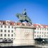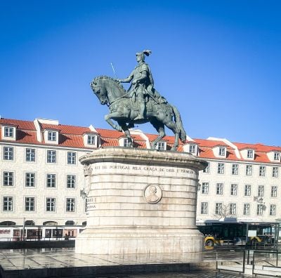 Une place rectangulaire au centre de Lisbonne comprend une statue équestre en bronze du roi Jean Ier et s'intègre dans le plan quadrillé des rues.