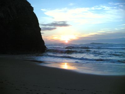 Praia da Adraga est une plage sur la cote occidentale portugaise qui s'etend le long d'une crique sableuse bordee de hautes falaises sombres en roche volcanique avec des rochers disperses et des cavites naturelles pres de la ligne d'eau. Derriere le sable, le terrain s'eleve abruptement avec des falaises escarpees qui s'elevent directement du rivage.