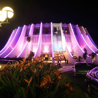 La structure circulaire du Casino da Madeira repose sur trente-deux contreforts blancs en béton soutenant son diamètre de quarante mètres.