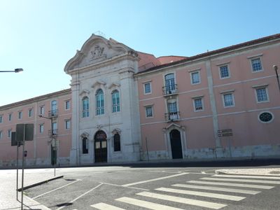 Le bâtiment en pierre présente une façade monumentale avec un portique principal surmonté des armoiries du Roi José I du Portugal.