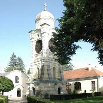 L'église de la Descente du Saint-Esprit présente une base rectangulaire avec un dôme central et des éléments architecturaux serbes traditionnels.