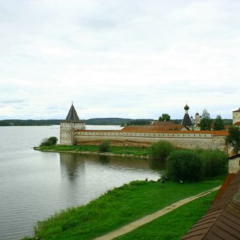 Kirillov est une ville de l'oblast de Vologda située entre deux lacs sur un terrain élevé, affichant un mélange de structures en pierre et de bâtiments en bois. Le centre est dominé par un grand monastère aux murs blancs qui définit toute la scène.