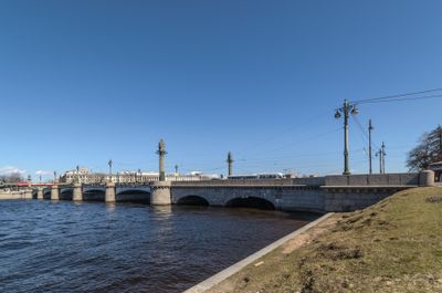 Le pont Ouchakov s'étend sur 254 mètres au-dessus de la Bolshaya Nevka avec neuf travées et présente des arches décoratives revêtues de granit.