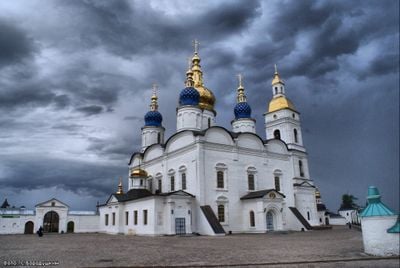 La Cathédrale Sainte-Sophie et de la Dormition s'élève à 47 mètres dans le complexe du Kremlin de Tobolsk, avec d'épais murs en briques.