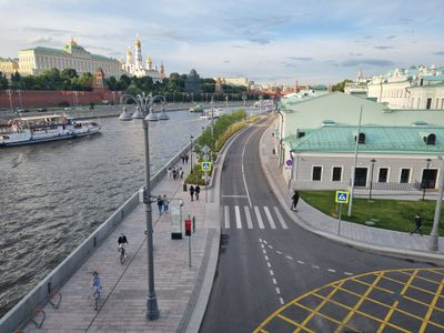 Le quai s'étend le long de la rivière Moskova, reliant la rue Serafimovicha à la rue Balchug entre des demeures historiques.
