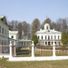 La maison principale blanche comprend quatre ailes de deux étages reliées par des galeries à colonnes, avec un grand escalier en pierre menant à un étang et jardin.