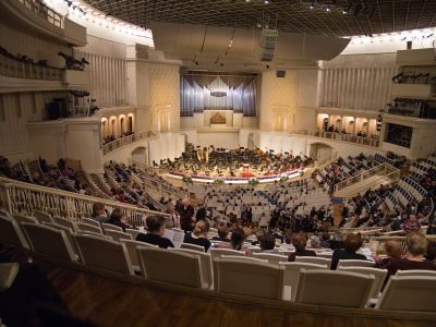 La Salle de Concert P. I. Tchaikovsky présente une configuration en amphithéâtre de 1.505 places et intègre des éléments architecturaux du style Empire stalinien.