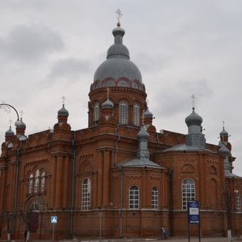 La cathédrale se dresse au centre d'Oboyan, avec une entrée par le portail occidental principal et des zones séparées pour les hommes et les femmes.