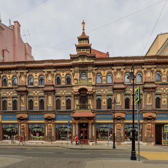 La Maison du Thé de la rue Myasnitskaya est un bâtiment de trois étages avec des ornements d'inspiration chinoise à Moscou. Des carreaux de céramique, des sculptures et des éléments finement travaillés couvrent toute la façade, créant un extérieur visuellement singulier.