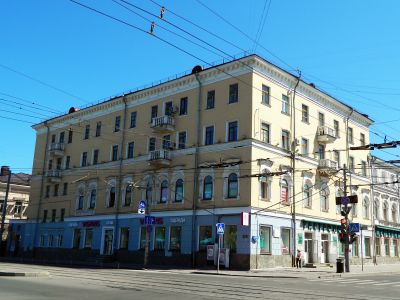 La librairie Piotrowski occupe un bâtiment de deux étages à l'intersection de la rue Lénine et de la rue Sibirskaya au centre de Perm.