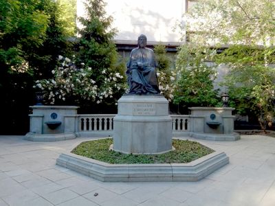 La Statue de Nizami Ganjavi est un monument en bronze présentant le poète persan en tenue traditionnelle tenant un livre. La figure se dresse sur une base décorée dans un cadre paysager de Moscou.
