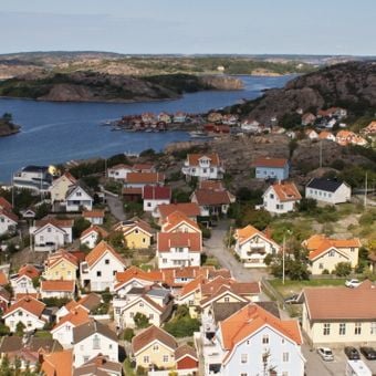 Fjällbacka est un établissement côtier sur la côte ouest suédoise avec une montagne de 74 mètres appelée Vetteberget qui s'élève en son centre et les gorges de Kungsklyftan qui traversent le paysage. L'arrangement resserré des maisons, des quais de bateaux et des formations rocheuses crée un cadre caractéristique où les bâtiments s'nichent entre l'eau et la pierre.