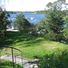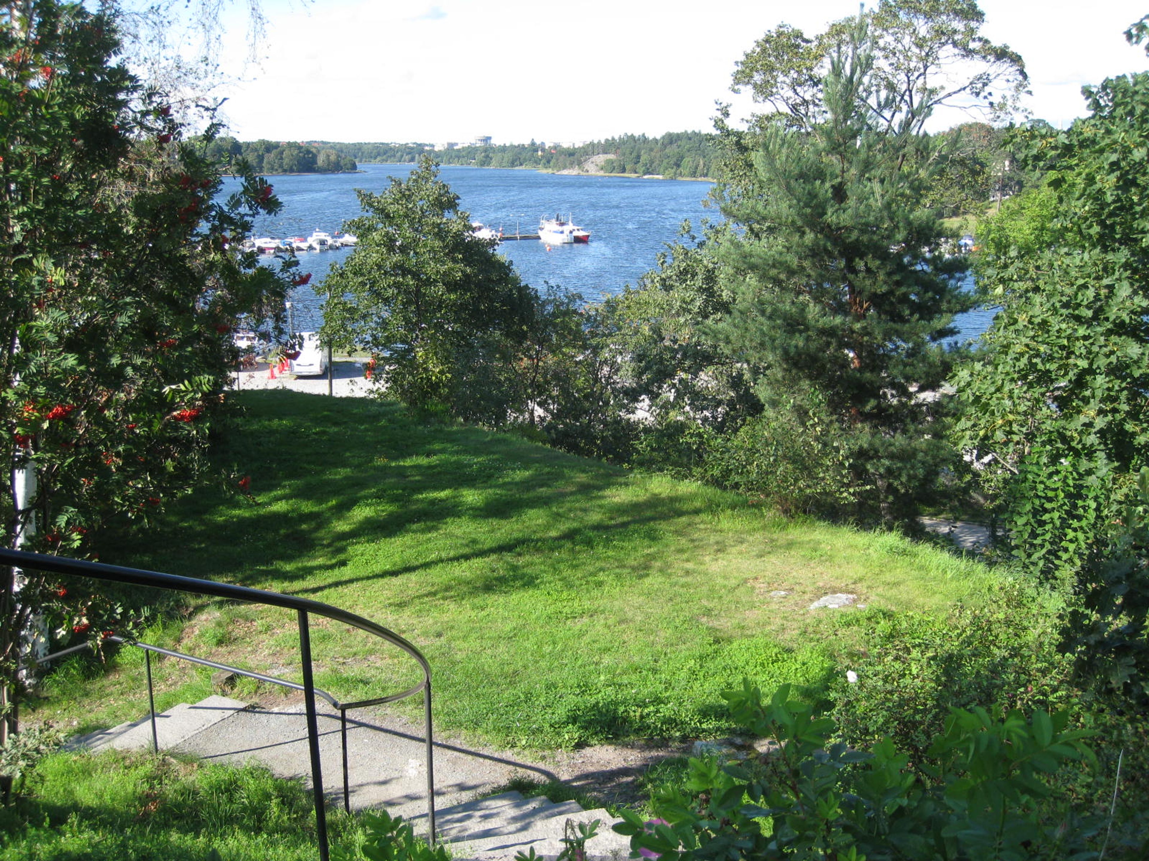 Les espaces verts et les chemins piétonniers s'étendent sur plusieurs niveaux de terrain, offrant des vues sur Stockholm.