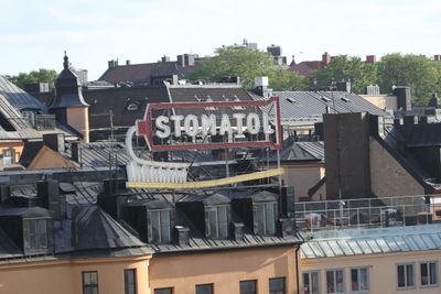 L'enseigne lumineuse est visible depuis plusieurs points près de la station Slussen, particulièrement depuis la zone de Kornhamnstorg.