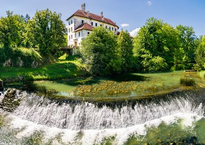 Gradac est un château de pierre positionne sur un coude du fleuve Lahinja en Slovenie, entoure d'un fossé de protection qui longe tout son perimetre. Le batiment affiche des caracteristiques de la Renaissance avec un parc entourant la propriete et contenant des structures historiques liees aux habitants anterieurs.