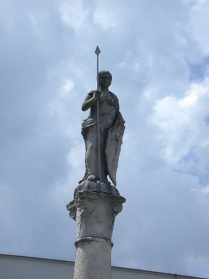 Column of Justina of Padua, Säule mit Statue auf dem Carpaccio Platz in Koper, Slowenien