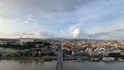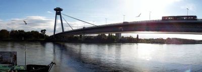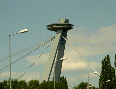 Le pont présente une structure circulaire à 95 mètres de hauteur abritant un restaurant, ressemblant à une soucoupe volante avec vue sur Bratislava.